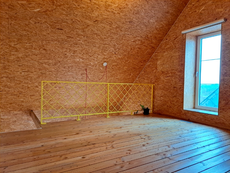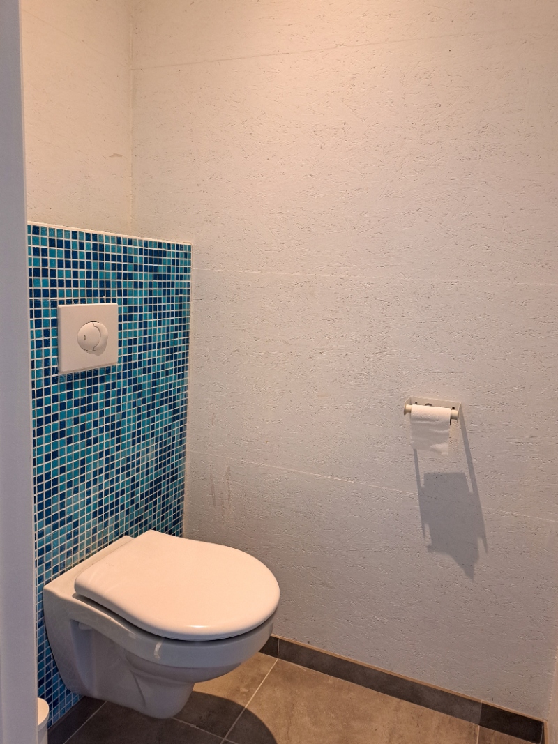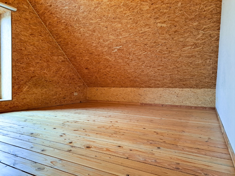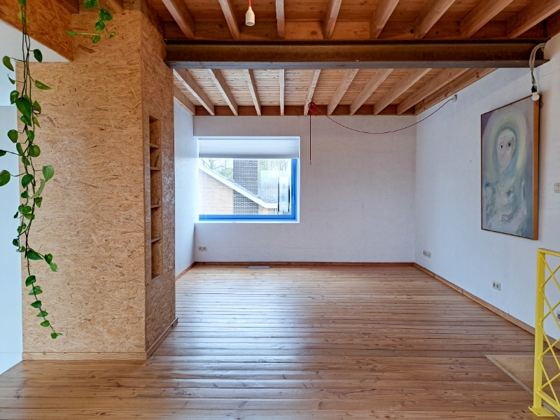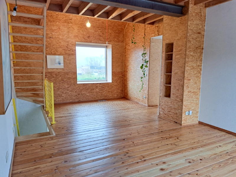 Op het gelijkvloers vind je een inkomhal, een badkamer met douche, lavabo en aansluiting voor een wasmachine, een apart toilet, een bureauruimte/kleine slaapkamer met ingebouwde kasten (geschikt voor een eenpersoonsbed), een garage en berging met uitgietbak en toegang tot het terras. De binnenafwerking is grotendeels uitgevoerd in architecturale OSB-platen, wat een warme, eigentijdse sfeer en een unieke vorm van architecturale expressie creëert.