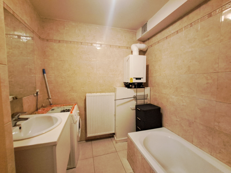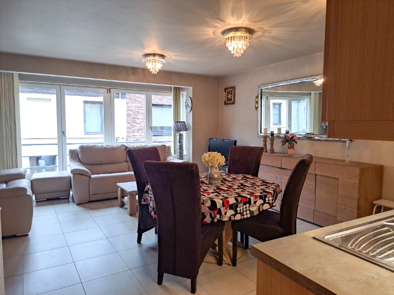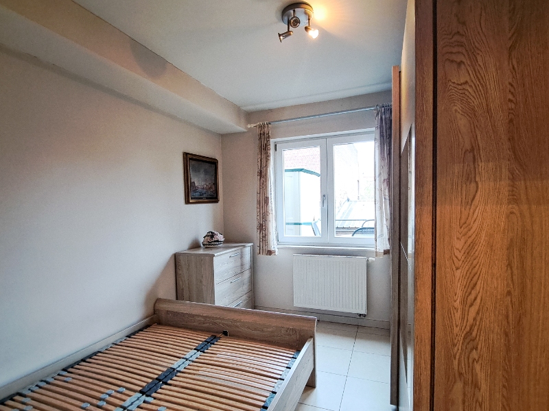 Het appartement omvat een hal, gastentoilet, lichtrijke leefruimte met geïnstalleerde open keuken, badkamer met bad en aansluiting voor een wasmachine, twee slaapkamers en een zonnig terras. Op het gelijkvloers is er bovendien een bijhorende overdekte staanplaats en een private berging (bij aan te kopen voor €15.000).