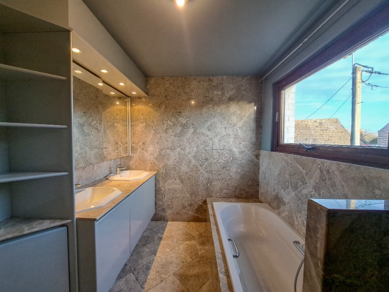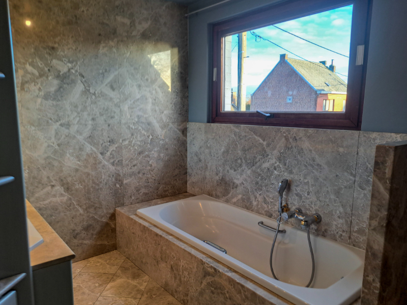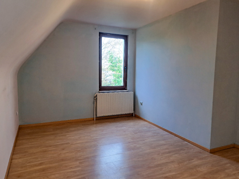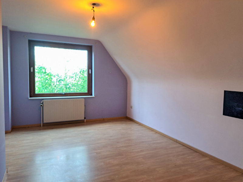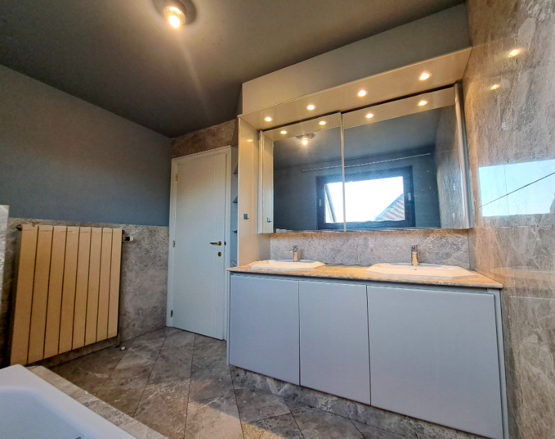 De trap brengt u naar de tussenverdieping met een eerste comfortabele slaapkamer. Op de bovenverdieping bevinden zich de ruime nachthal en de hoofdbadkamer met dubbele lavabo, bad en toilet. Daarnaast zijn er nog drie volwaardige slaapkamers, waarbij de masterbedroom extra luxe biedt met een inbouwkast en een aparte ruimte voor een dressing. Tevens is er op deze verdieping een doucheruimte met lavabo voorzien. Een luik in de hal biedt toegang tot de praktische bergzolder.